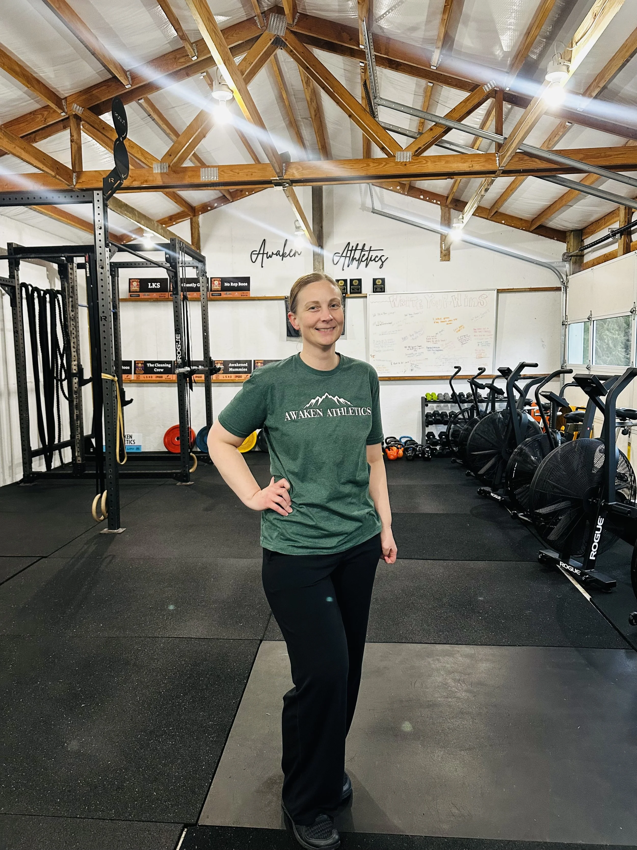 When I first started coming to Awaken Athletics my goal was to simply show up, work hard, and be better than I was the day before. Every work out posed some new type of challenge like learning how to lift weight properly and always increasing my endurance! Once I started regularly coming and got used to the routine I wanted to get in to shape. I felt like it had been so long since I felt confident in my own skin especially after having two kids. My goals now are to continue to show up for myself but also to get stronger, faster, and be able to do some of the more challenging movements- toes to bar, I am coming for you!
